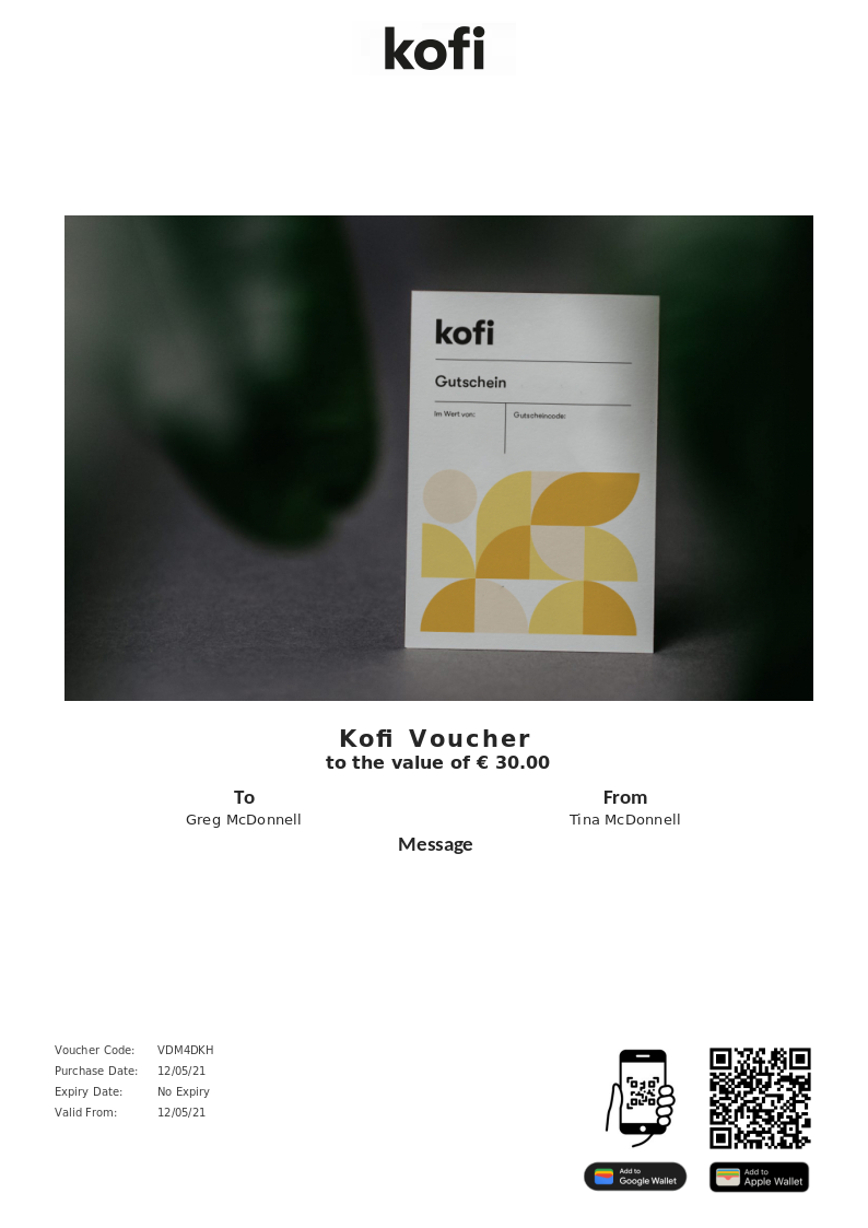 Kofi allows you to purchase instantly printable gift vouchers, special offers and tickets using the Voucher Connect platform.